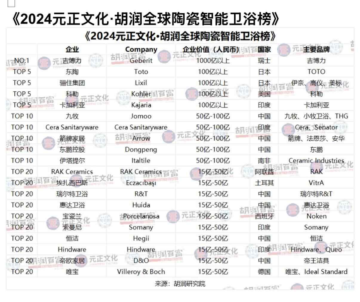 5月27日,胡润研究院在上海发布《2024元正文化·胡润全球陶瓷智能卫浴榜》及《2024元正文化·胡润中国建陶绿色低碳产区榜》,分别列出了以智能卫浴为发展重点的全球最具价值陶瓷企业TOP20,以及中国建筑陶瓷行业绿色低碳表现最优的十大产区。