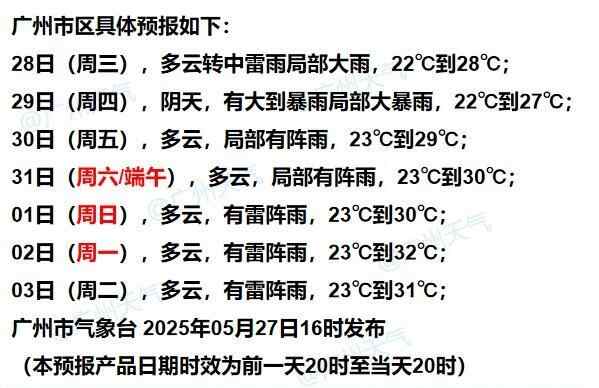 @广州天气预计,28日午后到29日有一次大雨到暴雨局部大暴雨降水过程,并伴有强对流天气。这波降雨恰逢上下班高峰期及端午节前出行高峰,路遇不明积水请勿冒险涉水,驾车请注意降速控距亮尾。
