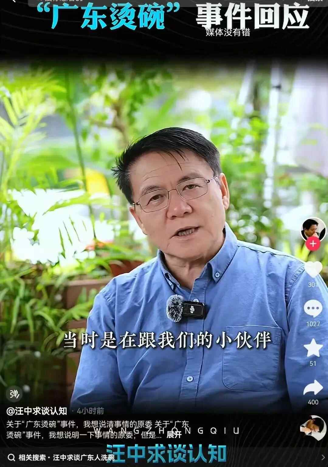 在回应里,汪中求还指责部分网友歪曲事实、断章取义。但网友们反驳说,他的言论本身就存在问题,从视频中他皱着眉头、满脸嫌弃的表情,就能看出他对广东人烫碗习惯的厌恶,并非被恶意剪辑。“自己说话不过脑子,还怪别人歪曲,真的很可笑。”有网友这样评价。