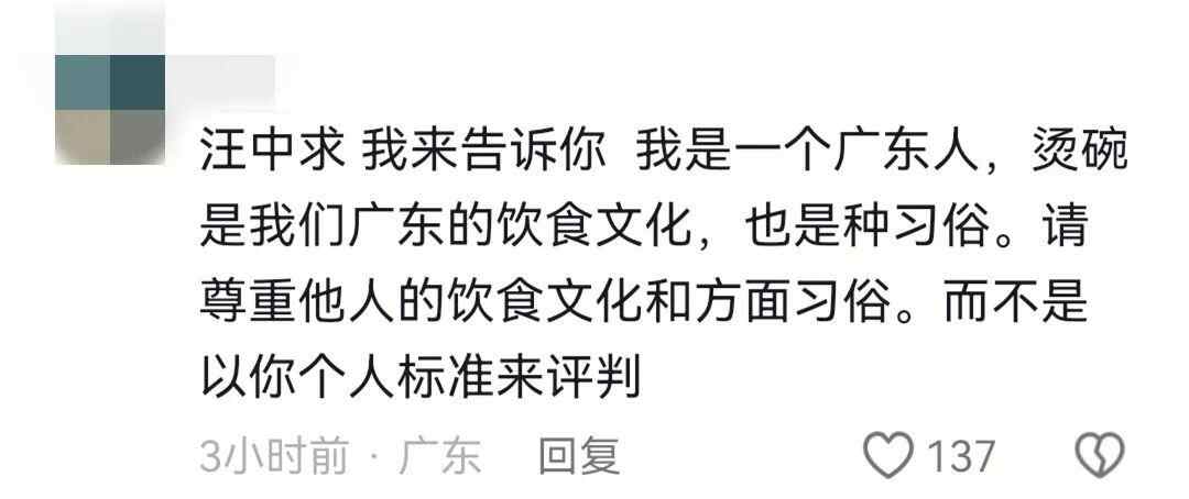 回应视频发布后,不少网友指出,汪中求既然探讨的是饮食行业卫生标准,就不应将广东烫碗习俗带入并以“恶心”形容。有网友表示:“谈卫生标准就专注于标准和执行的问题,无端把广东的饮食习俗扯进来,还进行贬低,这不是跑题了吗?这完全是对广东地域文化的不尊重。”还有网友说:“他的回应避重就轻,没有认识到自己用不当词汇评价地域习俗的错误,反而继续强调自己探讨卫生标准的初衷,可这和他侮辱性的言论有什么关联呢?”