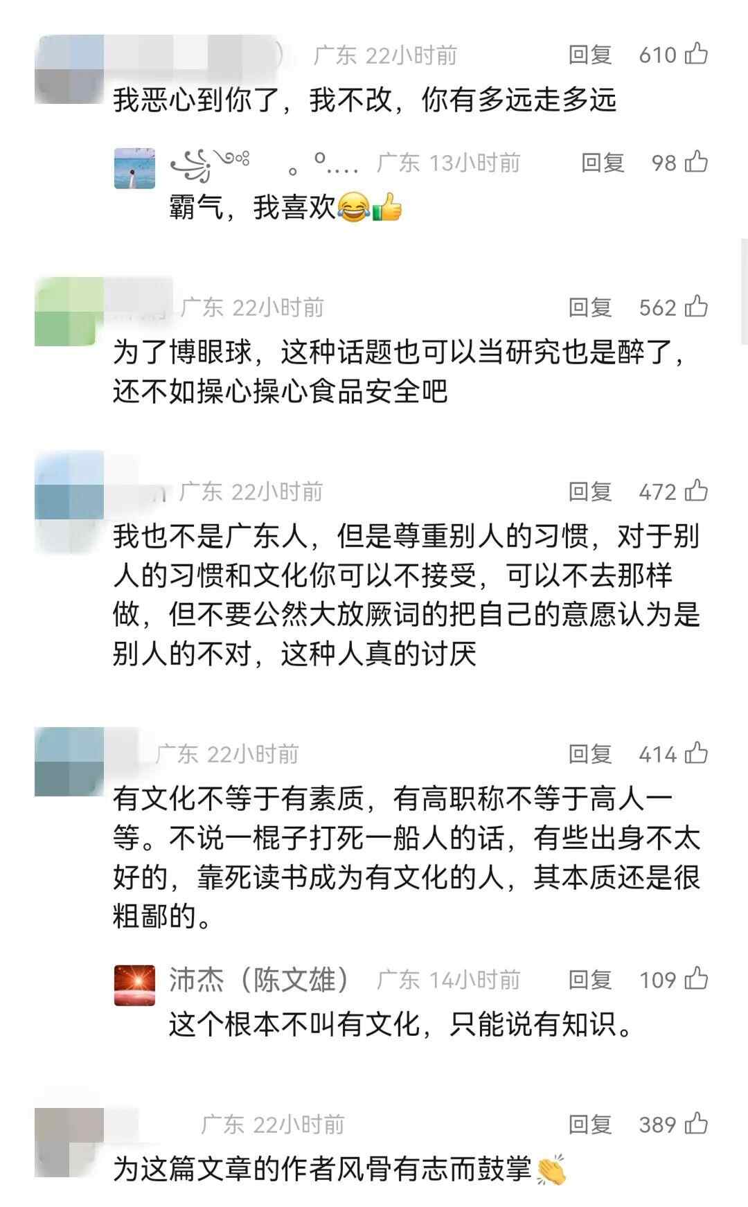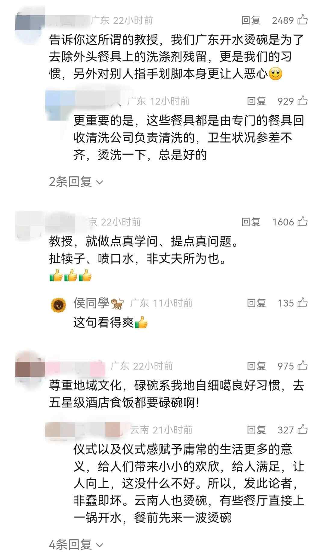 对于“呐喊”这一说法,广东网友纷纷强调,烫碗是当地长期形成的生活习惯,是基于对卫生的考量,也是广东茶文化延伸出的一种餐桌仪式感,和对社会的“呐喊”毫无关系。“这只是我们追求生活品质和卫生健康的方式,怎么就被他曲解成这样?简直是莫名其妙!”一名广东网友气愤地表示。