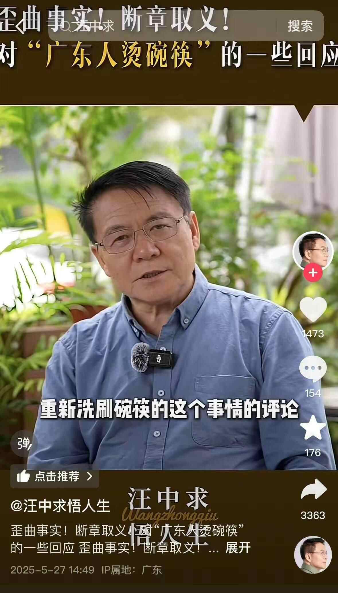 或许是看到自己“恶心”广东人烫碗的论调在舆论场引起了不小的风波,汪教授又发了个视频,回应有关争议。