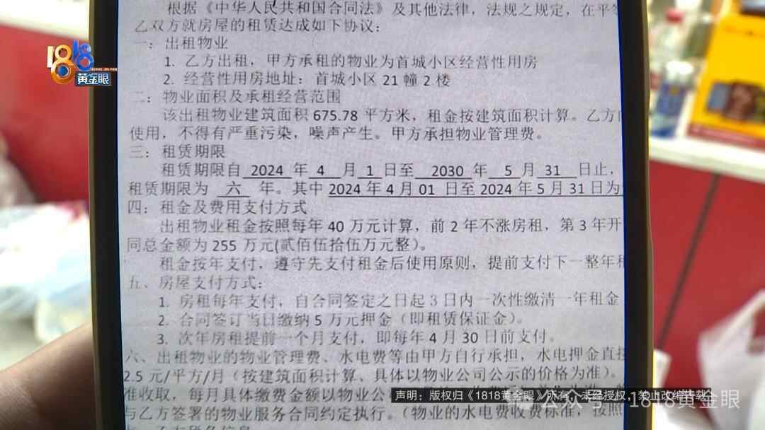 龙老板介绍,去年4月他看中杭州临平首城小区,外围二楼的一处商铺,建筑面积600多平,年租金40万元,他和当时的业委会签了租赁合同准备开个超市。