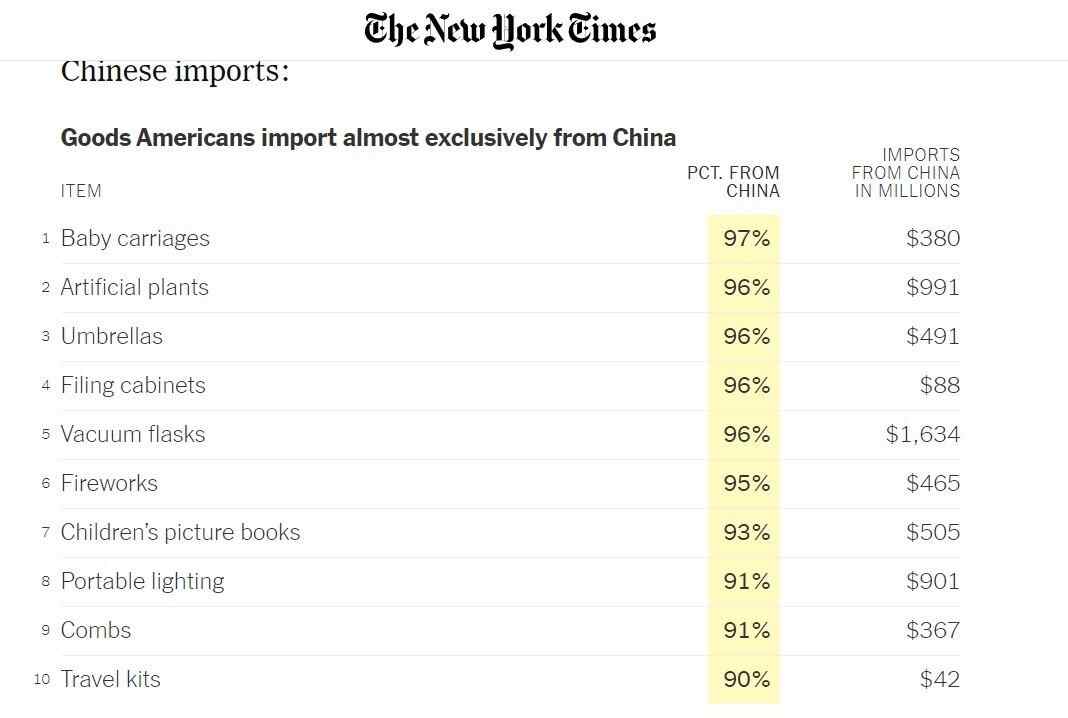 文章说,根据美国国际贸易委员会2024年发布的数据,中国是美国多个商品品类的唯一或主要进口来源国。具体来看:几乎完全从中国进口的品类包括婴儿车、仿真植物、雨伞、烟花、儿童绘本等,进口金额最高的品类主要有电话、计算机、汽车及零部件、视频显示器、电热器、玩具等;进口数量最大的品类主要是各类塑料制品,包括塑料日用品和工业用塑料件等。
