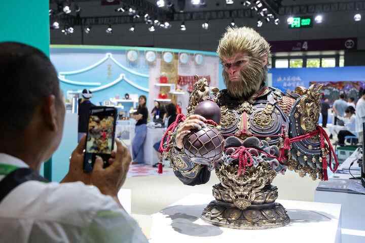 观众在深圳举行的文博会上拍摄黑神话悟空半身像(2025年5月23日摄)。新华社记者 梁旭 摄