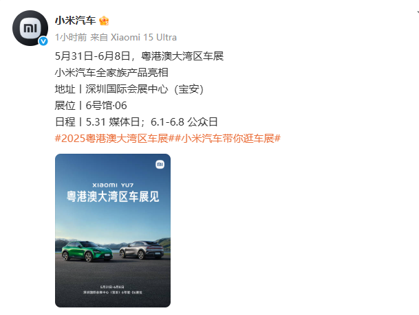 5月26日,小米汽车发文称,小米汽车全家族产品将在粤港澳大湾区车展亮相。图片显示,小米YU7确认参加粤港澳大湾区车展。
