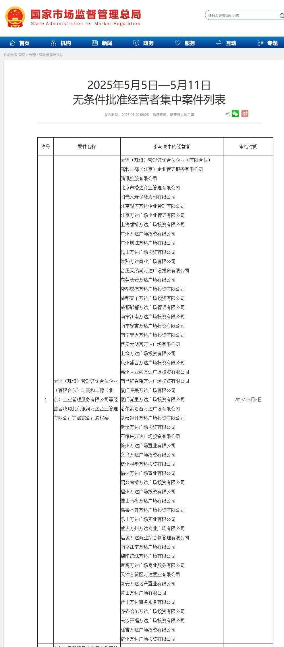 5月20日,国家市场监督管理总局官网发布了《2025年5月5日—5月11日无条件批准经营者集中案件列表》。