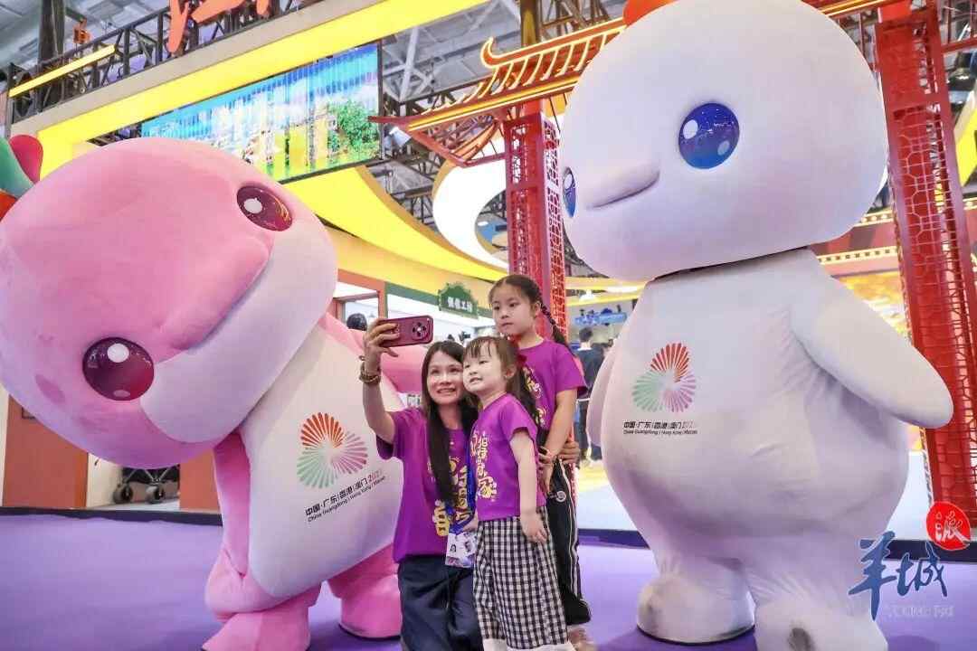 文博会广东展团,妈妈带着孩子与十五运会吉祥物“喜洋洋”“乐融融”合影。羊城晚报记者 刘畅 摄