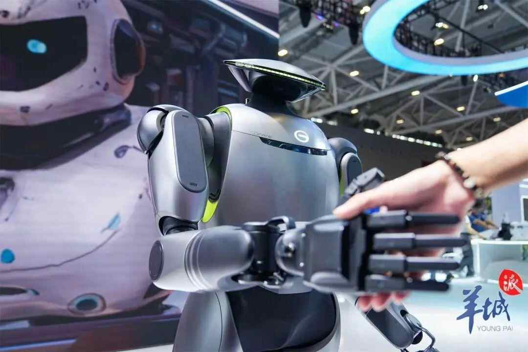 文博会上,人形机器人与人握手。羊城晚报记者 梁喻 摄