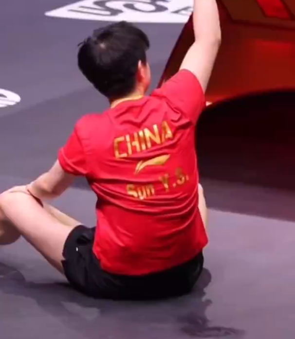 最后一球落下,孙颖莎力竭倒地,赛后她更是动容落泪。孙颖莎躺下后起身,汗水将背后的“CHINA”印在地上。