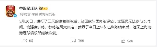 5月26日,进行了三天的康复训练后,经国家队医务组评估,武磊仍无法参与长时间、高强度训练。教练组研究决定,武磊于今日上午队伍训练结束后,返回上海海港足球俱乐部继续恢复。