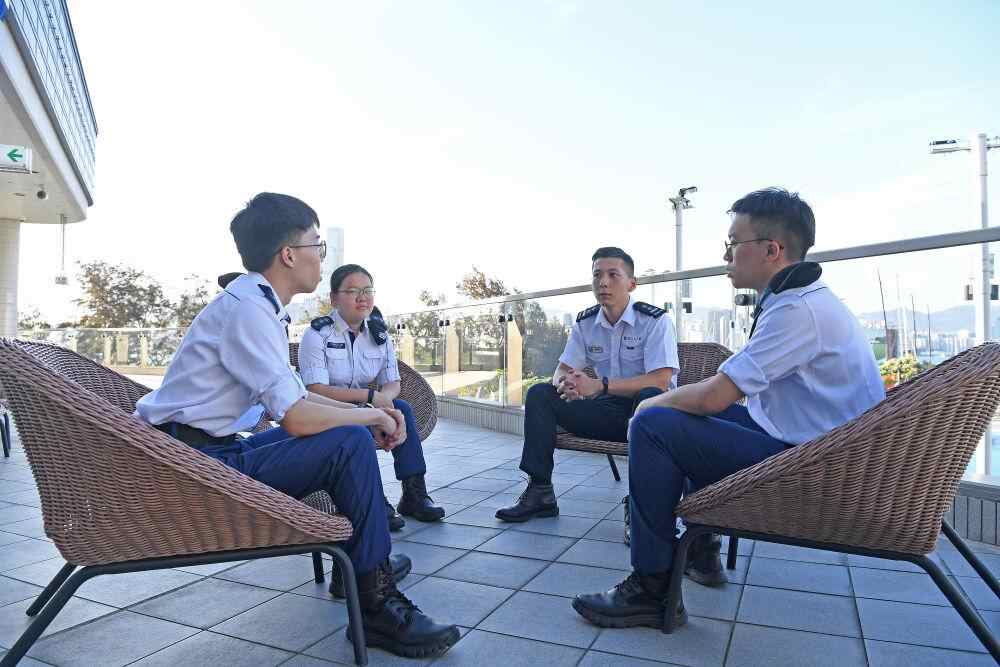 警察公共关系部少年警讯高级督察傅斯扬(右二)与张灏泓(右一)、曾梓轩(左一)、徐骅美在警官会所内交流(5月15日摄)。新华社发