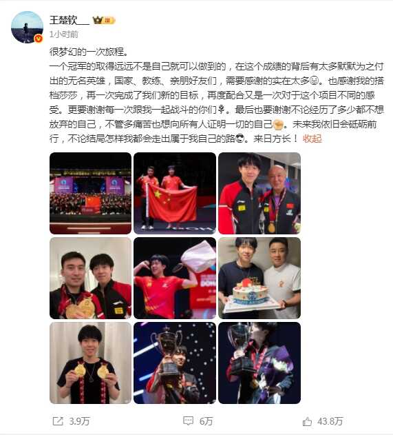 5月26日,王楚钦在多哈夺冠后,通过微博发文,向在取得冠军成绩背后默默付出的无名英雄表示感谢,同时也感谢了自己的搭档孙颖莎: