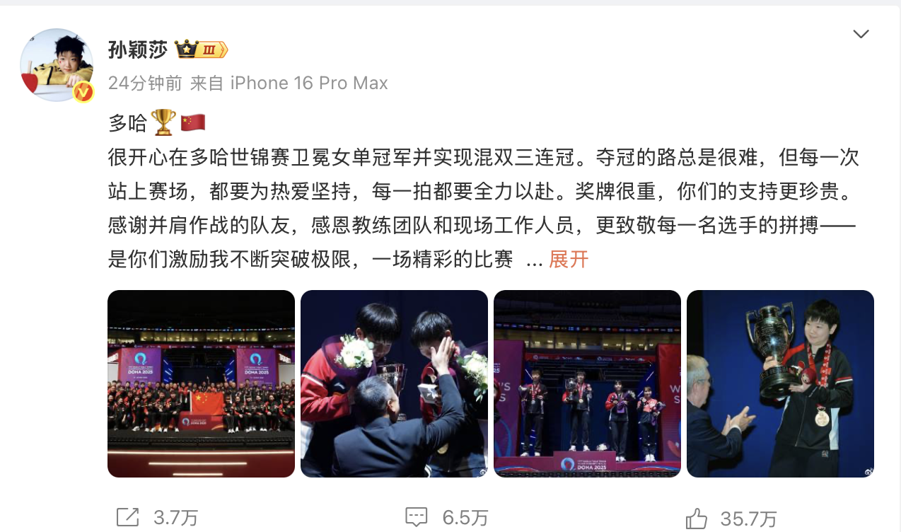 5月26日,孙颖莎在多哈世锦赛卫冕女单冠军并实现混双三连冠后,通过微博致敬每一名选手的拼搏精神: