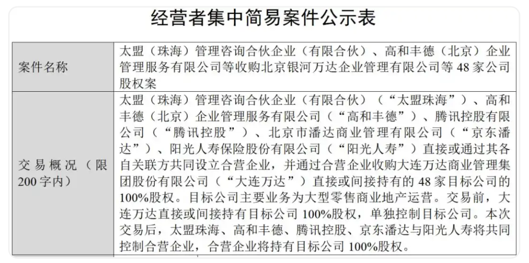 近日,据国家市场监管总局最新披露,太盟(珠海)管理咨询合伙企业(有限合伙,以下简称“太盟珠海”)、高和丰德(北京)企业管理服务有限公司(以下简称“高和丰德”)、腾讯控股有限公司(以下简称“腾讯控股”)、北京市潘达商业管理有限公司(以下简称“京东潘达”)及阳光人寿保险股份有限公司(简称“阳光人寿”)已达成合作,通过直接投资或关联方共同设立合营企业,完成对大连万达商业管理集团股份有限公司(以下简称“大连万达”)旗下48家目标公司100%股权的收购。此次交易涉及大连万达直接或间接持有的相关资产。
