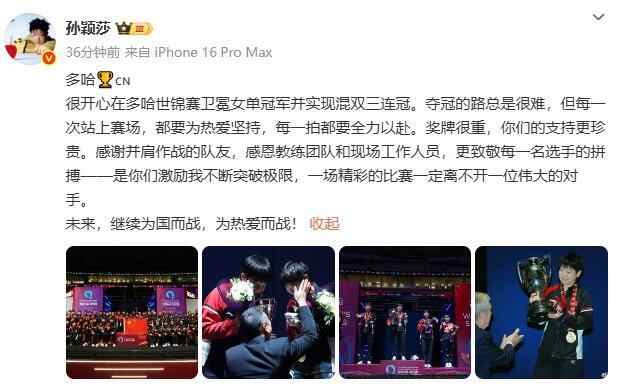 新京报讯 5月26日,孙颖莎发布微博总结多哈世乒赛,她表示“未来,继续为国而战,为热爱而战!”,以下为全文: