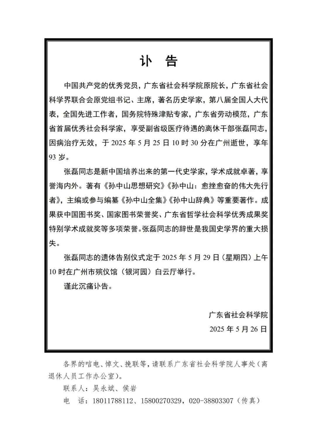5月26日,广东省社会科学院发布讣告,中国共产党的优秀党员,广东省社会科学院原院长,广东省社会科学界联合会原党组书记、主席,著名历史学家,第八届全国人大代表,全国先进工作者,国务院特殊津贴专家,广东省劳动模范,广东省首届优秀社会科学家,享受副省级医疗待遇的离休干部张磊同志因病治疗无效,于2025年5月25日10时30分在广州逝世,享年93岁。