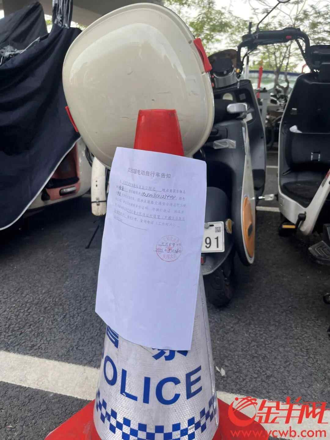 记者留意到,交警对无牌、套牌、假牌车辆进行暂扣后,会在现场留下一张《依法扣留电动自行车告知》,并将告知书贴在“雪糕筒”上,放回车辆原来的位置。车主发现车辆被扣留后,可按照《依法扣留电动自行车告知》相关内容接受处理。