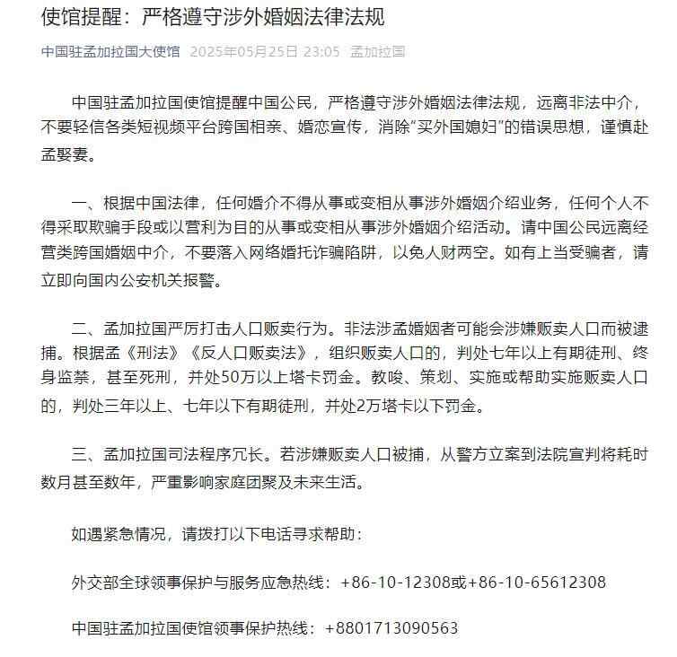 5月25日中国驻孟加拉国大使馆发布提醒:中国驻孟加拉国使馆提醒中国公民,严格遵守涉外婚姻法律法规,远离非法中介,不要轻信各类短视频平台跨国相亲、婚恋宣传,消除“买外国媳妇”的错误思想,谨慎赴孟娶妻。