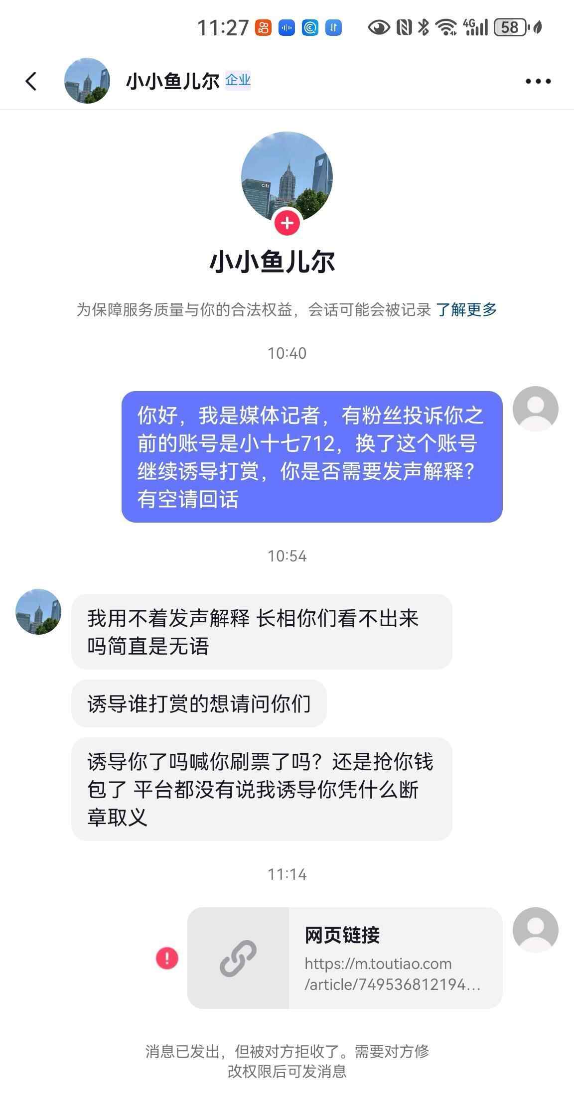 记者表明身份私信“小小鱼儿尔”:“有粉丝投诉你换了账号继续诱导打赏,是否需要发声解释一下。”“小小鱼儿尔”回复:我用不着发声解释,长相你们看不出来吗,简直是无语。诱导你了吗?还是抢你钱包了?平台都没有说我诱导,你凭什么断章取义?记者正欲进一步交流,发现已被拉黑。