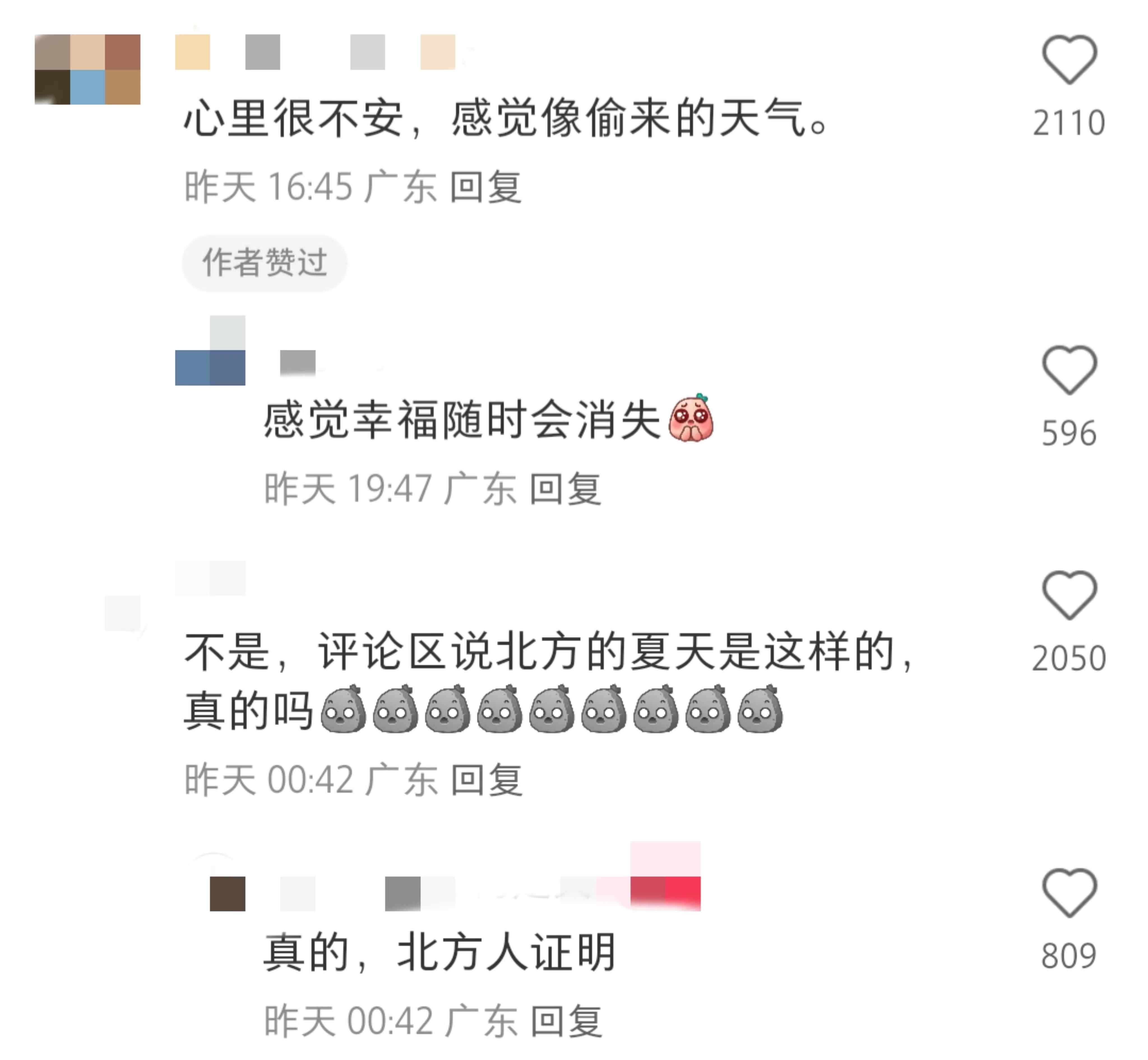 广东的网友纷纷表示:这天气好凉爽好舒服,一觉醒来不知道该穿长袖还是短袖了,甚至感觉这像是偷来的天气,也有网友表示这简直像是北方的夏天。