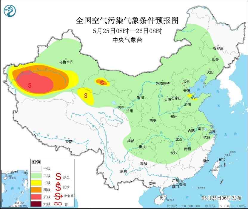 中央气象台5月25日6时表示,未来一周,全国大部地区大气扩散条件总体较好,新疆南疆盆地多扬沙或浮尘。27日至29日,新疆东部和南疆盆地、内蒙古西部、甘肃中西部等地的部分地区有扬沙或浮尘,局地有沙尘暴。