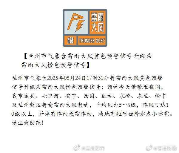 据兰州发布5月24日消息,兰州市气象台5月24日15时58分发布雷雨大风黄色预警信号,并于17时31分升级为橙色预警信号:预计当天傍晚至夜间,兰州多地受雷雨大风影响,平均风力5~6级,阵风可达10级以上。