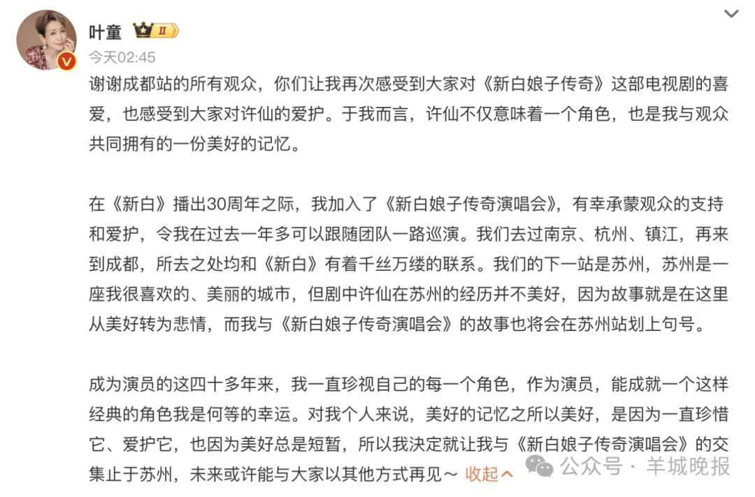 5月25日凌晨,叶童发文称决定不再参与《新白娘子传奇演唱会》,全文如下: