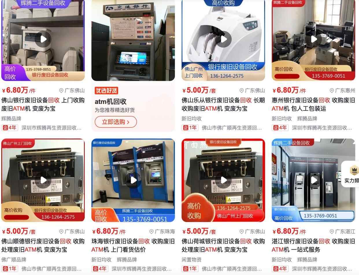 时代财经通过在百度旗下B2B平台“爱采购”搜索ATM机发现,银行的报废ATM机回收价在5万元/台左右;不过,在“闲鱼”等C2C二手交易平台,一台二手ATM机的价格则更低,仅为3000~5000元。