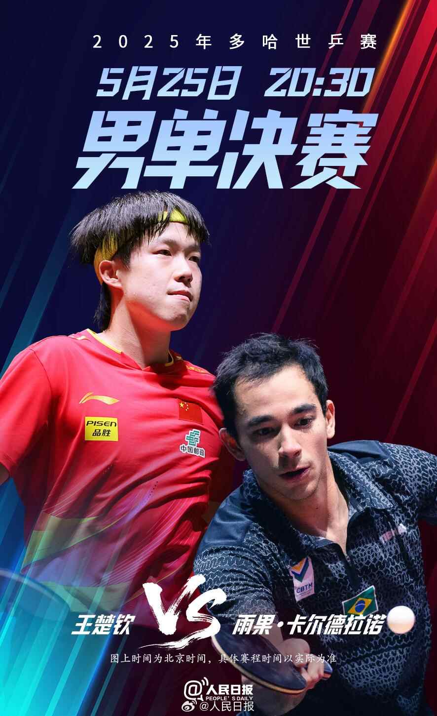 2025年多哈世乒赛男单决赛将于5月25日20:30举行,中国选手王楚钦对阵巴西选手雨果·卡尔德拉诺。