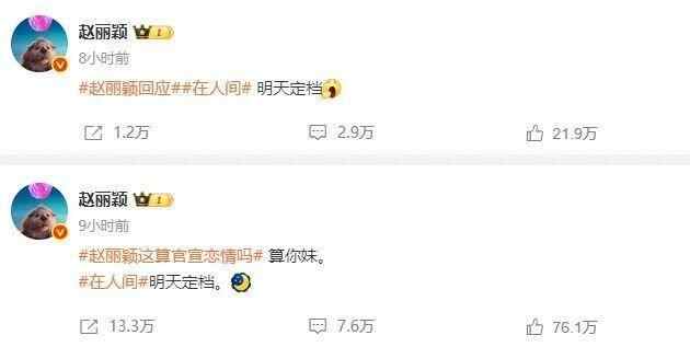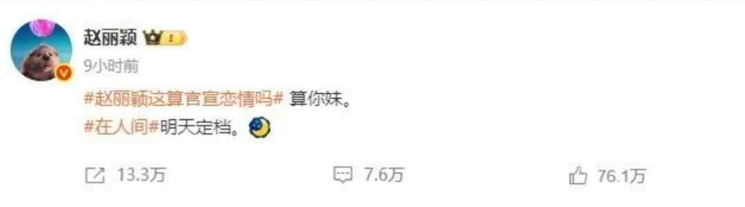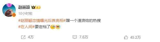赵丽颖在发文中带上了热搜词条#赵丽颖恋情曝光后首亮相#,并表示:“蹭一个渣浪给的热搜,《在人间》要定档了。”