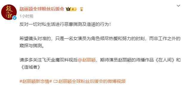 针对热搜话题,赵丽颖全球粉丝后援会发文称:“反对一切对私生活进行恶意揣测及造谣的行为!希望镜头对准的,只是一名女演员为角色倾尽热爱和努力的时刻,而非工作之外的窥探与揣测。”