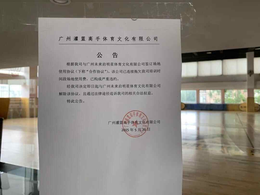 在环宇天地店,门口张贴了一张由广州灌篮高手体育文化有限公司5月20日发出的公告,表示“广州未来启明星体育文化有限公司已连续拖欠我司培训时间段场地使用费,已构成严重违约”,并表示“即日起与广州未来启明星体育文化有限公司解除场地使用协议,且通过法律途径追诉相关合法权益”。营业执照信息显示,广州未来启明星体育文化有限公司是东方启明星的登记名称。