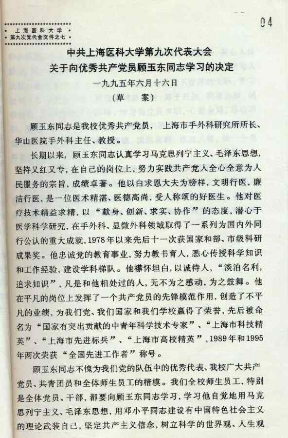 自1961年毕业以来,顾玉东院士始终坚守复旦上医人“为人群服务”的优良传统。他常说:“我们要继承颜福庆教授和黄家驷教授等前辈们埋头苦干、不争不抢的作风,唯一的目的是为普普通通的老百姓服务。”