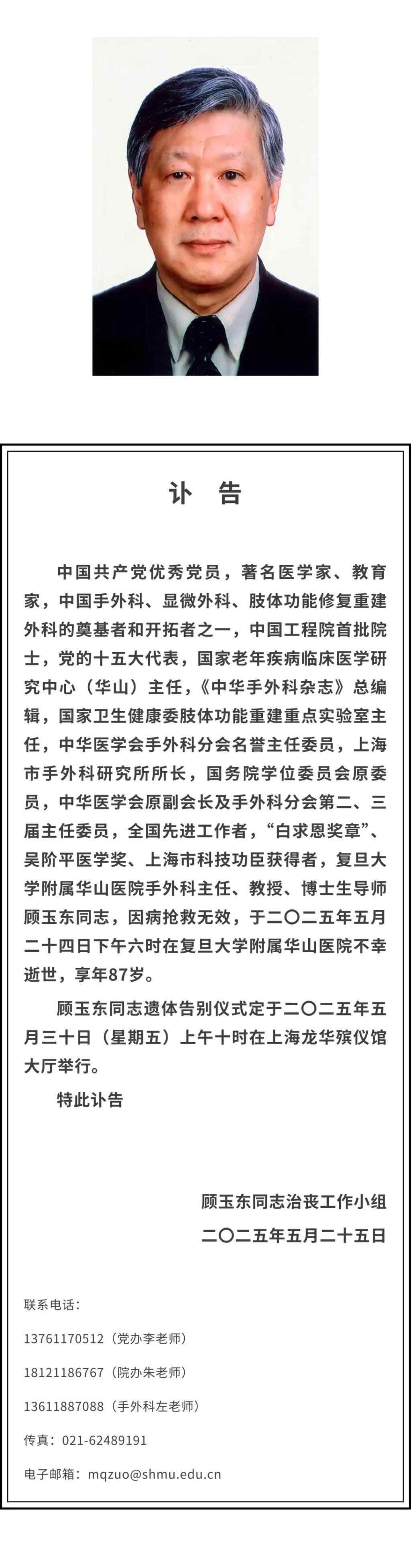 顾玉东遗体告别仪式定于2025年5月30日(星期五)上午10时在上海龙华殡仪馆大厅举行。