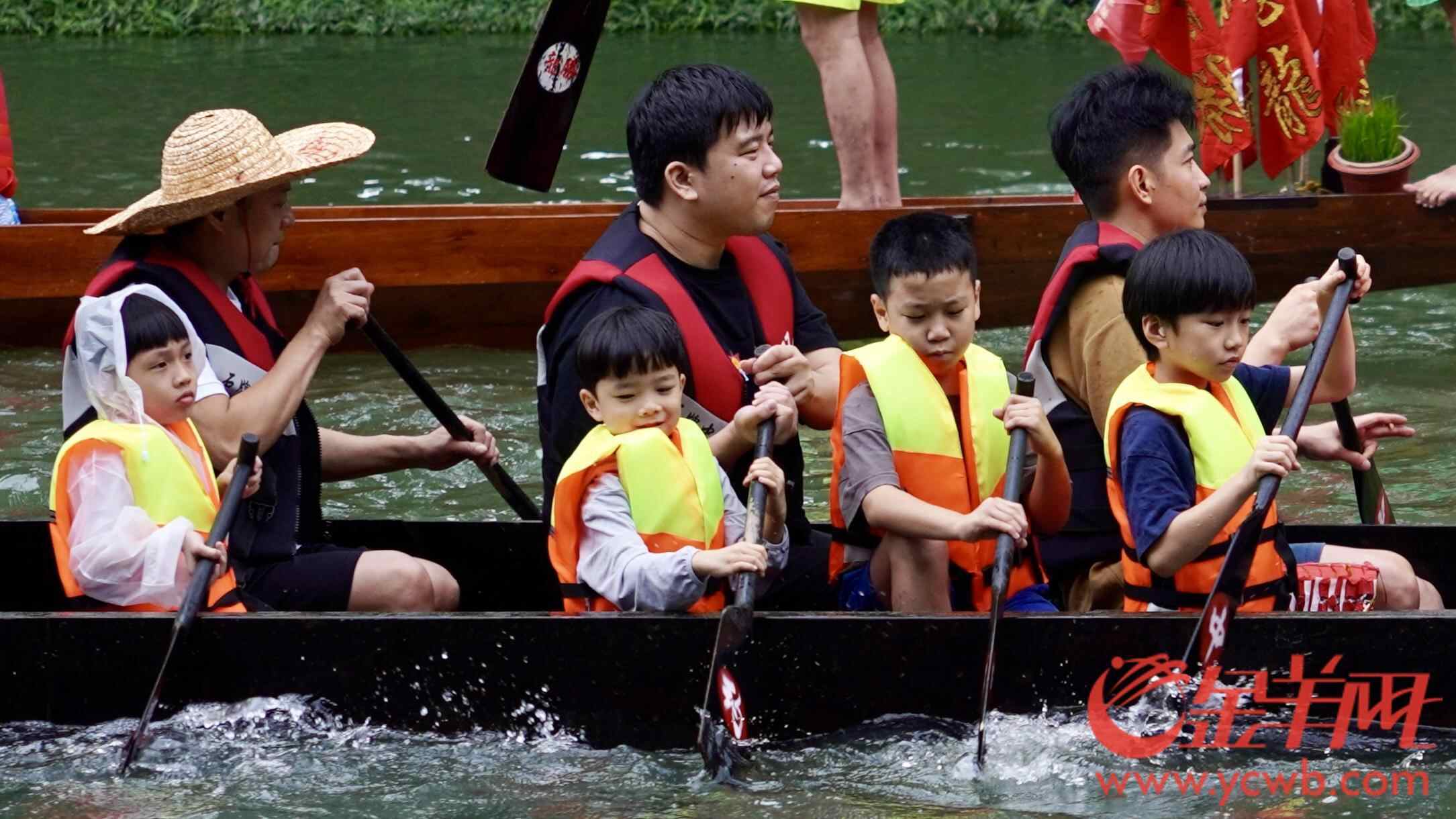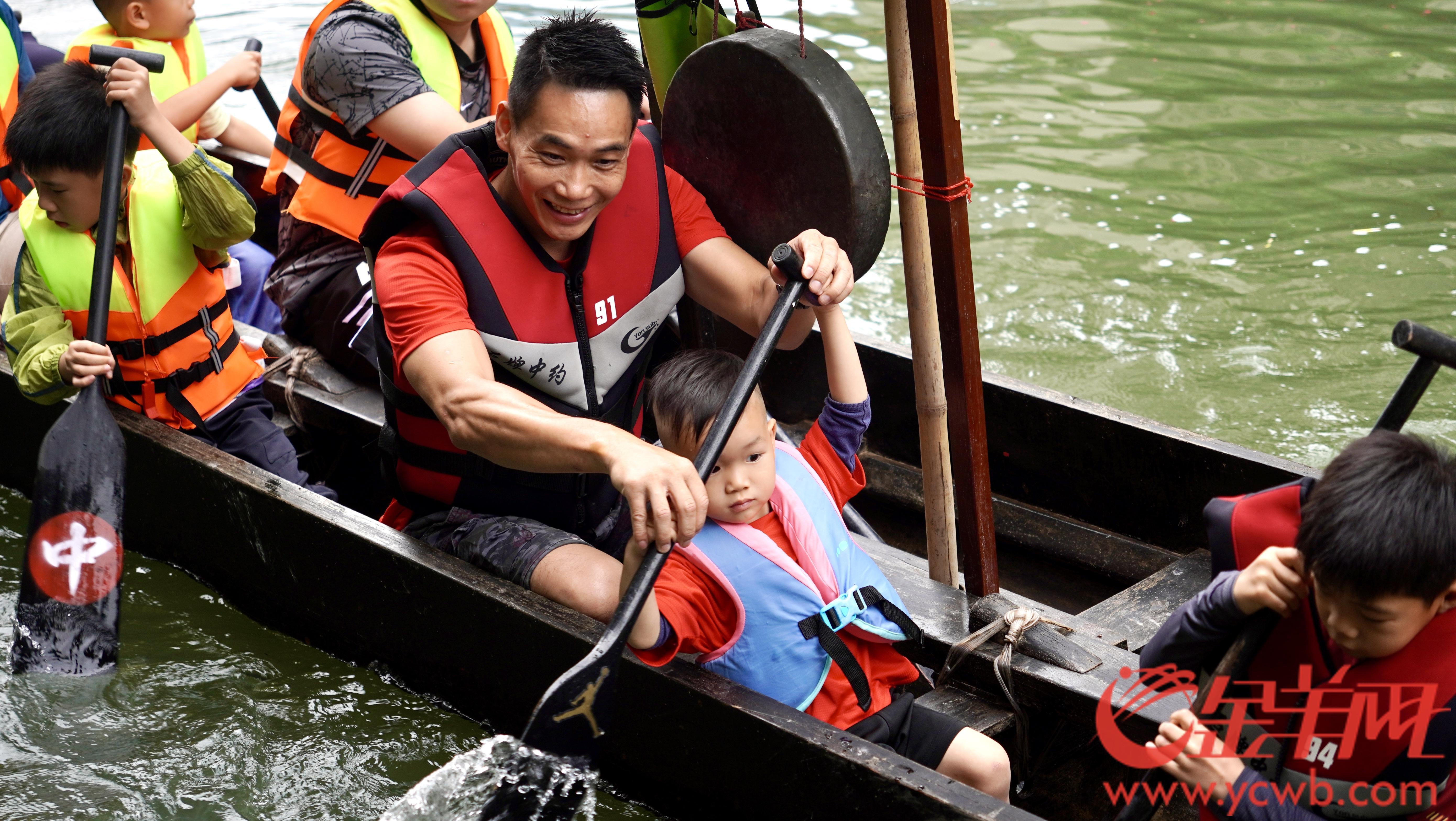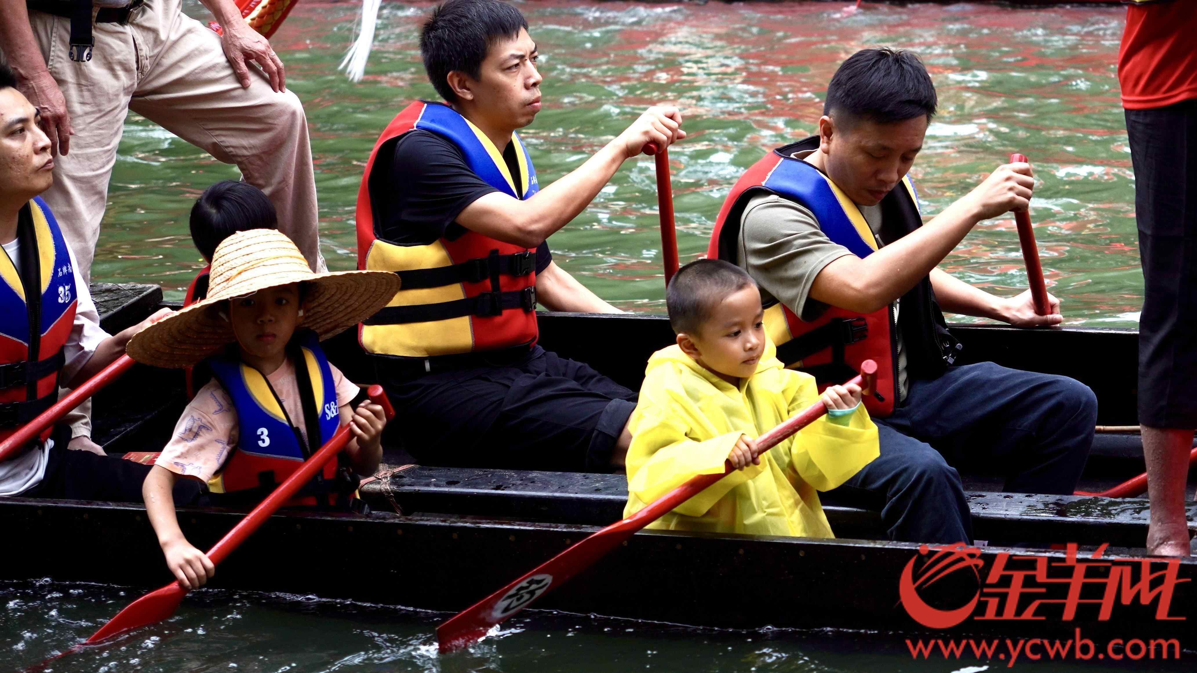 人群中,不乏父带子、爷带孙的,更有家庭三代同堂齐齐来扒龙船的,年轻一代接过船桡,伴随着龙舟前进的,还有拼搏奋进的石牌精神。