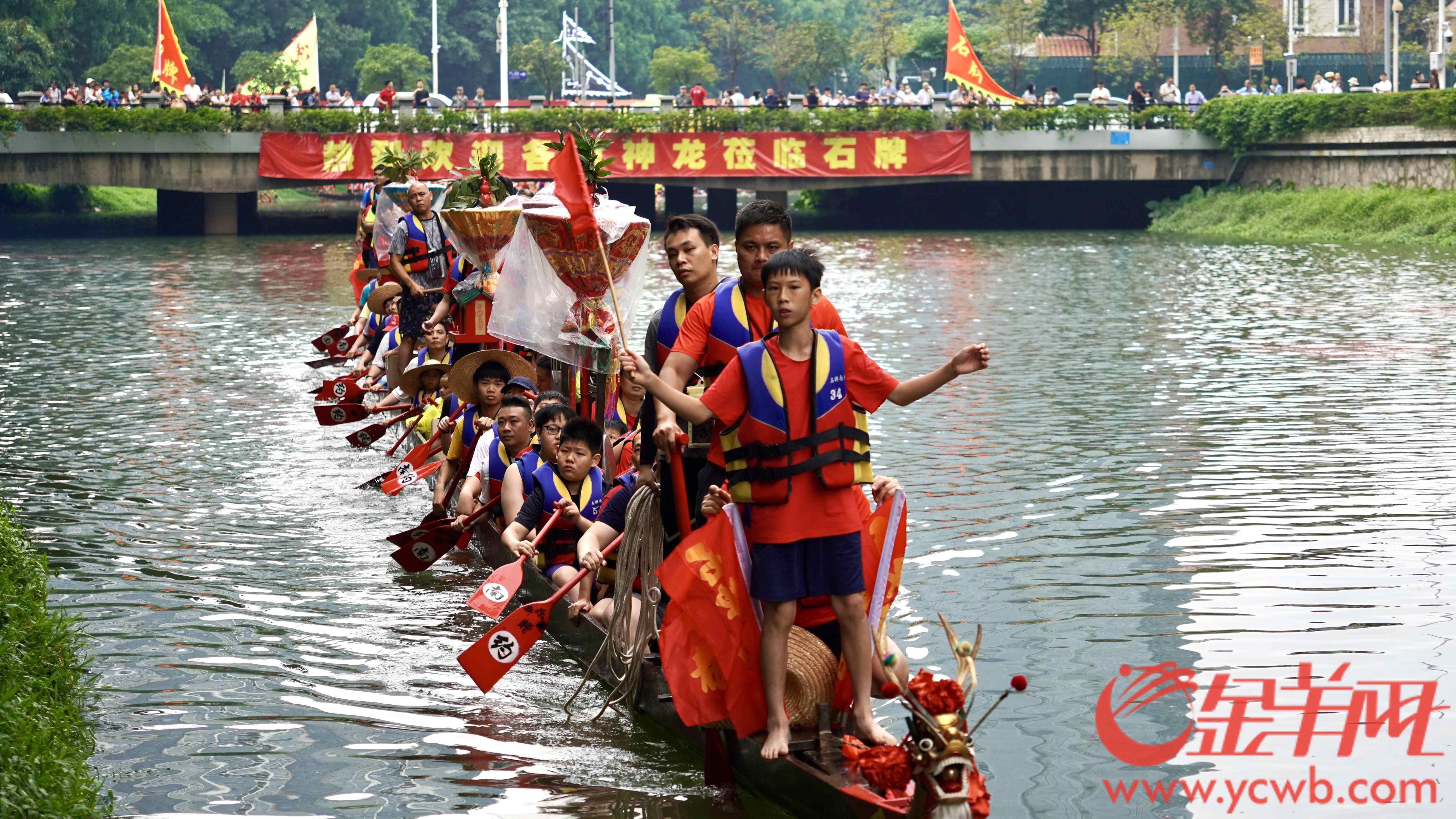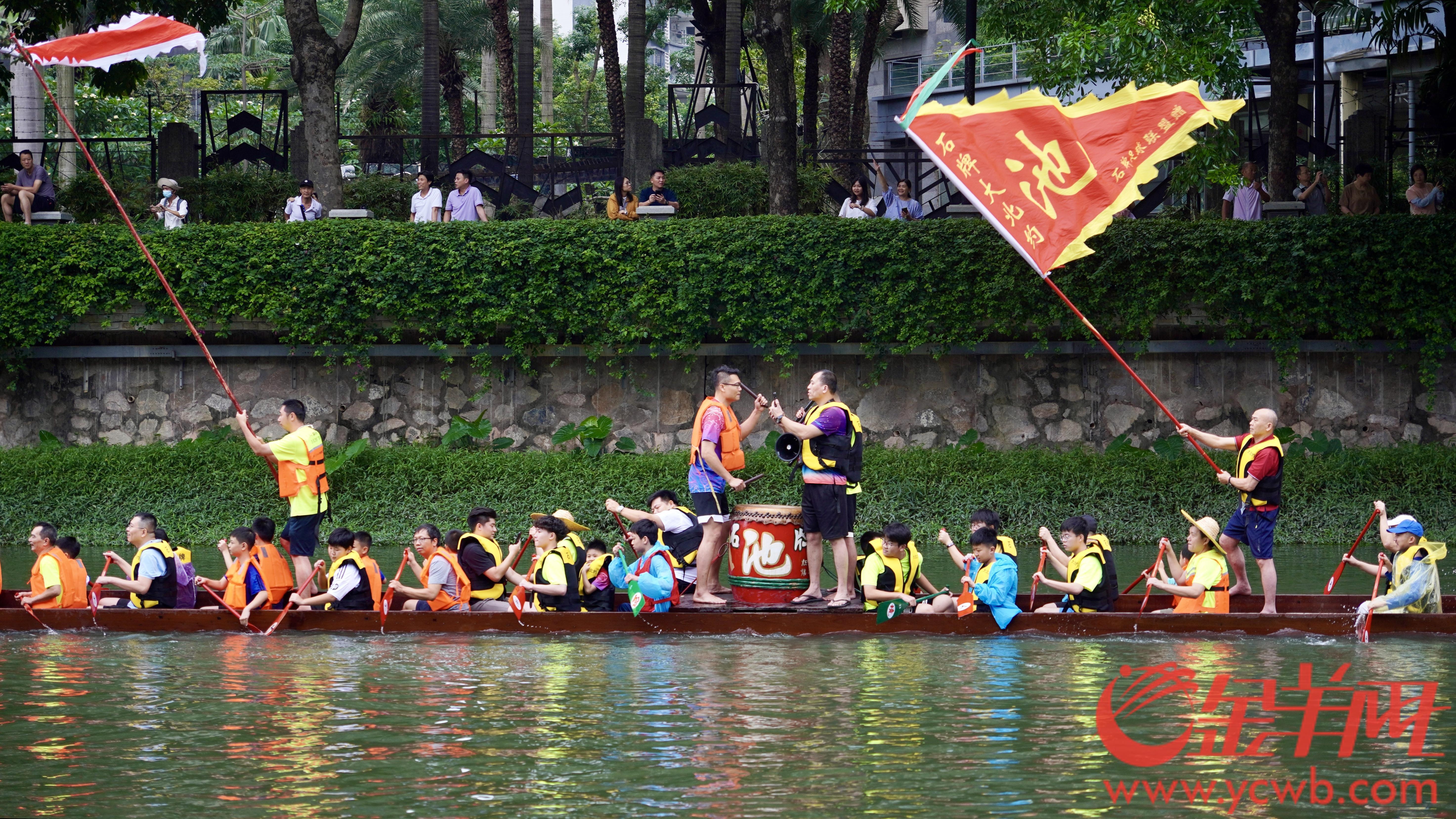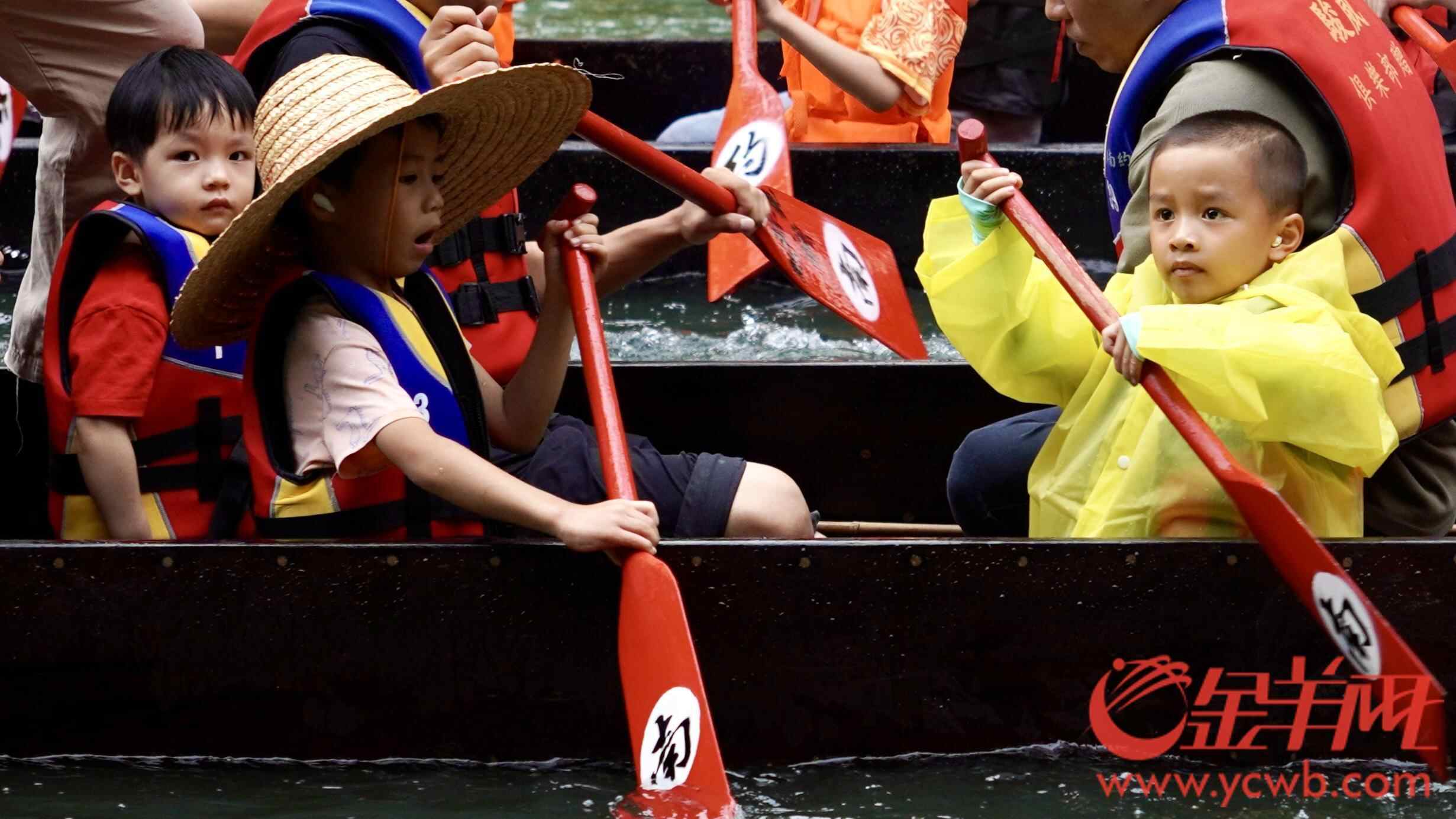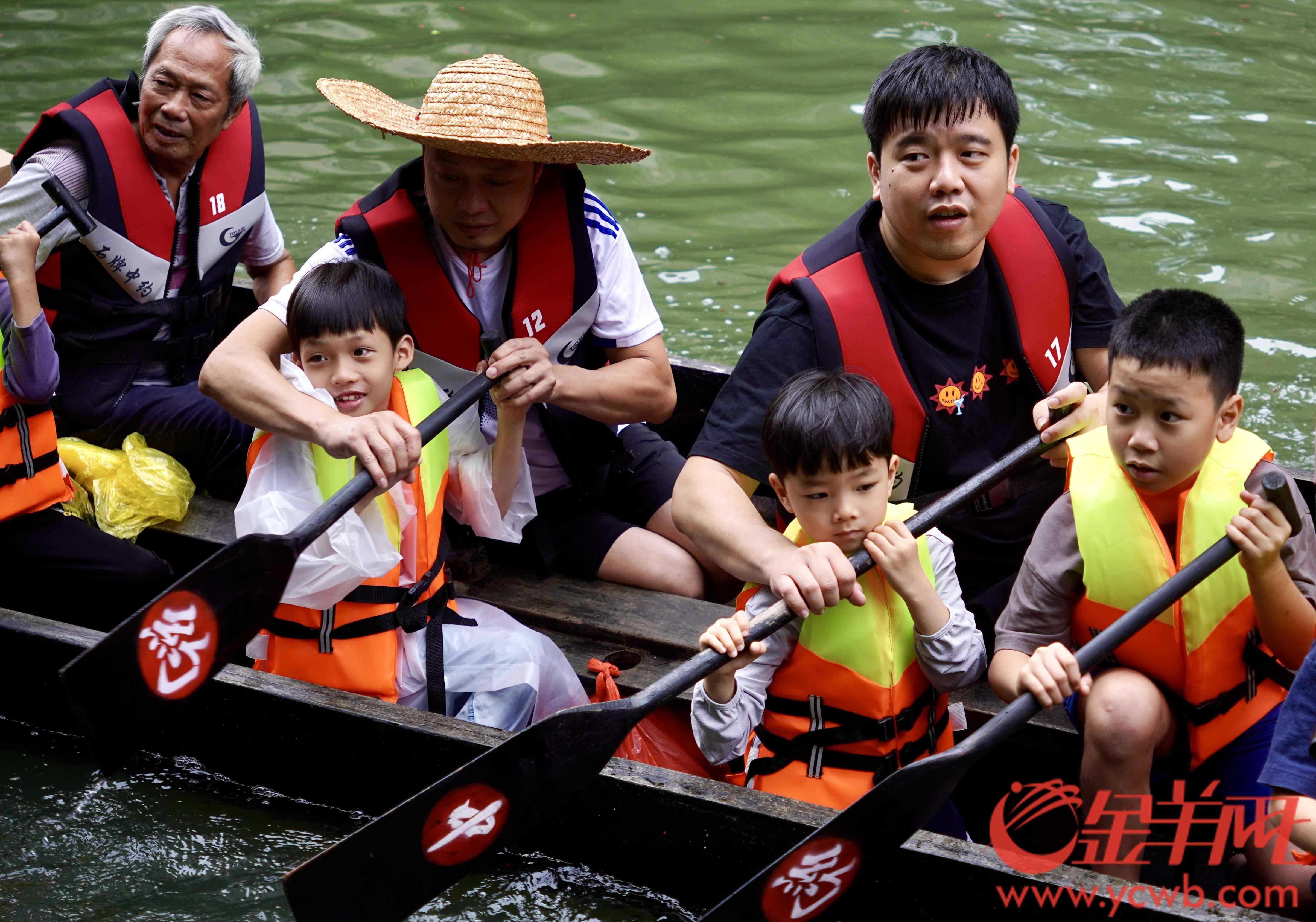 人群中,不乏父带子、爷带孙的,更有家庭三代同堂齐齐来扒龙船的,年轻一代接过船桡,伴随着龙舟前进的,还有拼搏奋进的石牌精神。