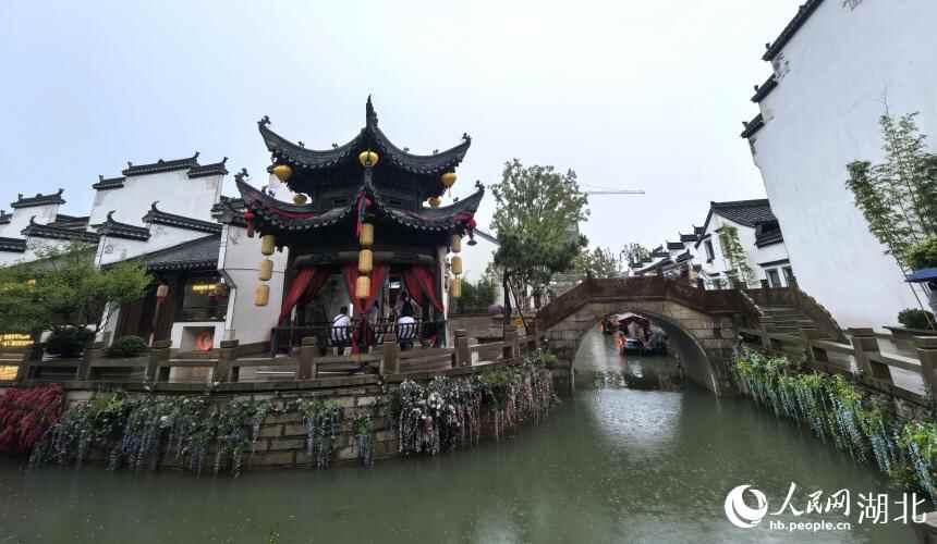 青砖黛瓦,翘角飞檐,复原迁建的传统古建筑错落有致;小桥流水,勾画出八湖八岛八胜景,九大建筑派系在此交融……5月22日,不少游客雨中漫步湖北云梦祥云湾,古色古香的老街在雨中有着独特风韵。