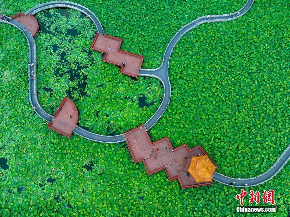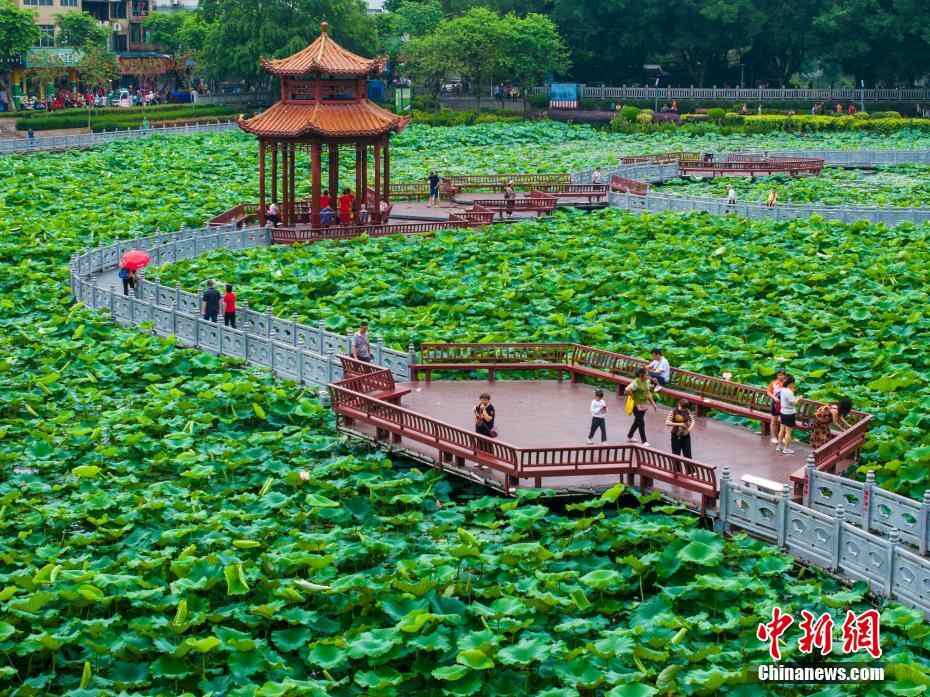 近日,广西梧州市万秀区潘塘公园的荷花陆续绽放,吸引不少游人前来拍照“打卡”。图为公园里的荷塘景色。