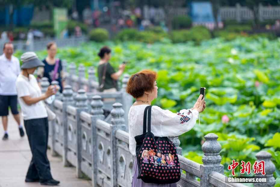 近日,广西梧州市万秀区潘塘公园的荷花陆续绽放,吸引不少游人前来拍照“打卡”。图为游人在公园赏荷。