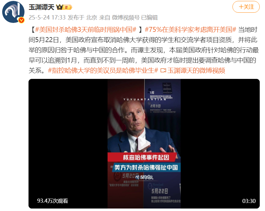 当地时间5月22日,美国政府宣布取消哈佛大学获得的学生和交流学者项目资质,并将此举的原因归咎于哈佛与中国的合作。据悉,本届美国政府针对哈佛的行动最早可以追溯到1月,而直到不到一周前,美国政府才临时提出要调查哈佛与中国的关系。