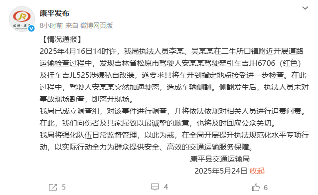 5月24日,康平县交通运输局发布《情况通报》,原文如下: