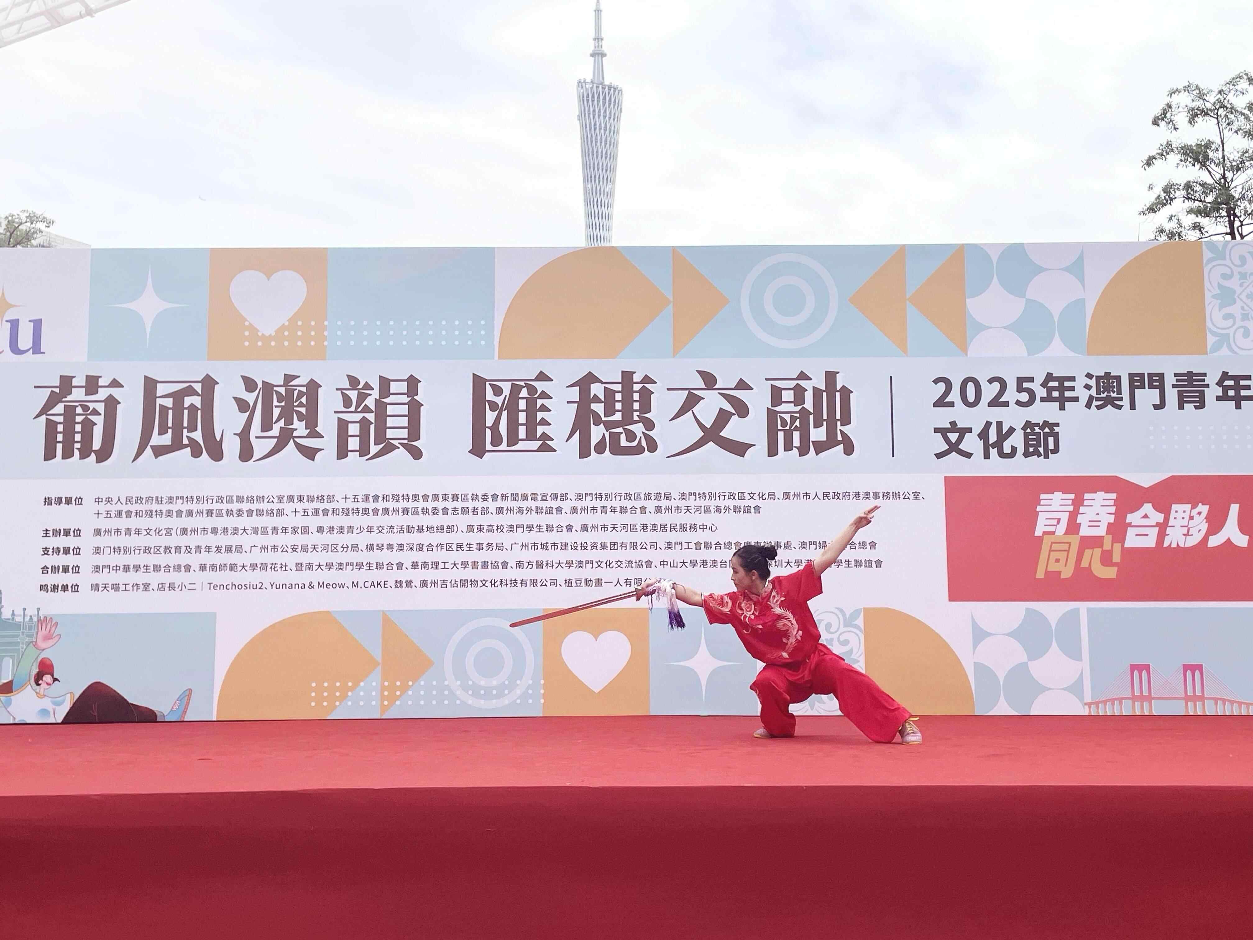 剑如游龙、拳如灵蛇,澳门同学植慧珊携手带来的武术表演一亮相,便吸引了全场目光。植慧珊在刚刚结束的广东省第十二届大学生运动会上,代表暨南大学一举拿下乙组女子自选长拳和自选剑术双料冠军。她以澳门青春力量传承着中华武术精神,也让现场观众深刻感受到了中华武术文化薪火相传的强大生命力。随后,来自粤澳联的青年学子们以一首《海阔天空》,唱出澳门青年的坚毅与热血。“原谅我这一生不羁放纵爱自由,也会怕有一天会跌倒......”熟悉的歌声跨山越海,彰显了粤港澳三地语言同宗、文化同源,诉说着血浓于水的深厚情谊。