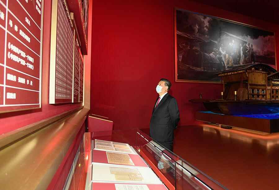在南湖红船复原景观前,习近平总书记仔细观看中国共产党第一次全国代表大会时全国58名党员名录、中国共产党第一个纲领等重要文件,细细感悟中国共产党人建党时的初心。