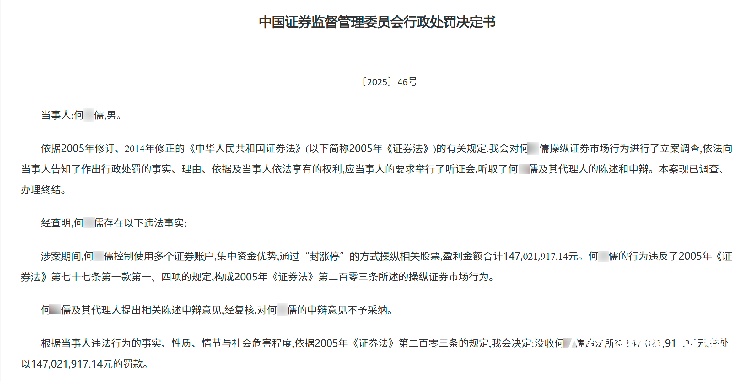 日前,证监会披露一则罚单显示,何某儒因操纵证券市场,受到证监会处罚,罚没合计2.94亿元。