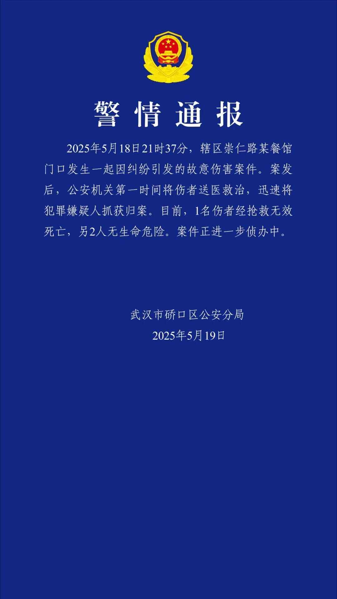 据平安硚口消息,2025年5月18日21时37分,武汉市硚口区崇仁路某餐馆门口发生一起因纠纷引发的故意伤害案件。案发后,公安机关第一时间将伤者送医救治,迅速将犯罪嫌疑人抓获归案。目前,1名伤者经抢救无效死亡,另2人无生命危险。案件正进一步侦办中。
