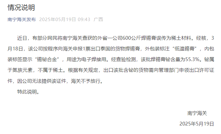 5月19日,广西南宁海关发布“情况说明”称,近日,有部分网民将南宁海关查获的外省一公司600公斤焊锡膏误传为稀土材料。