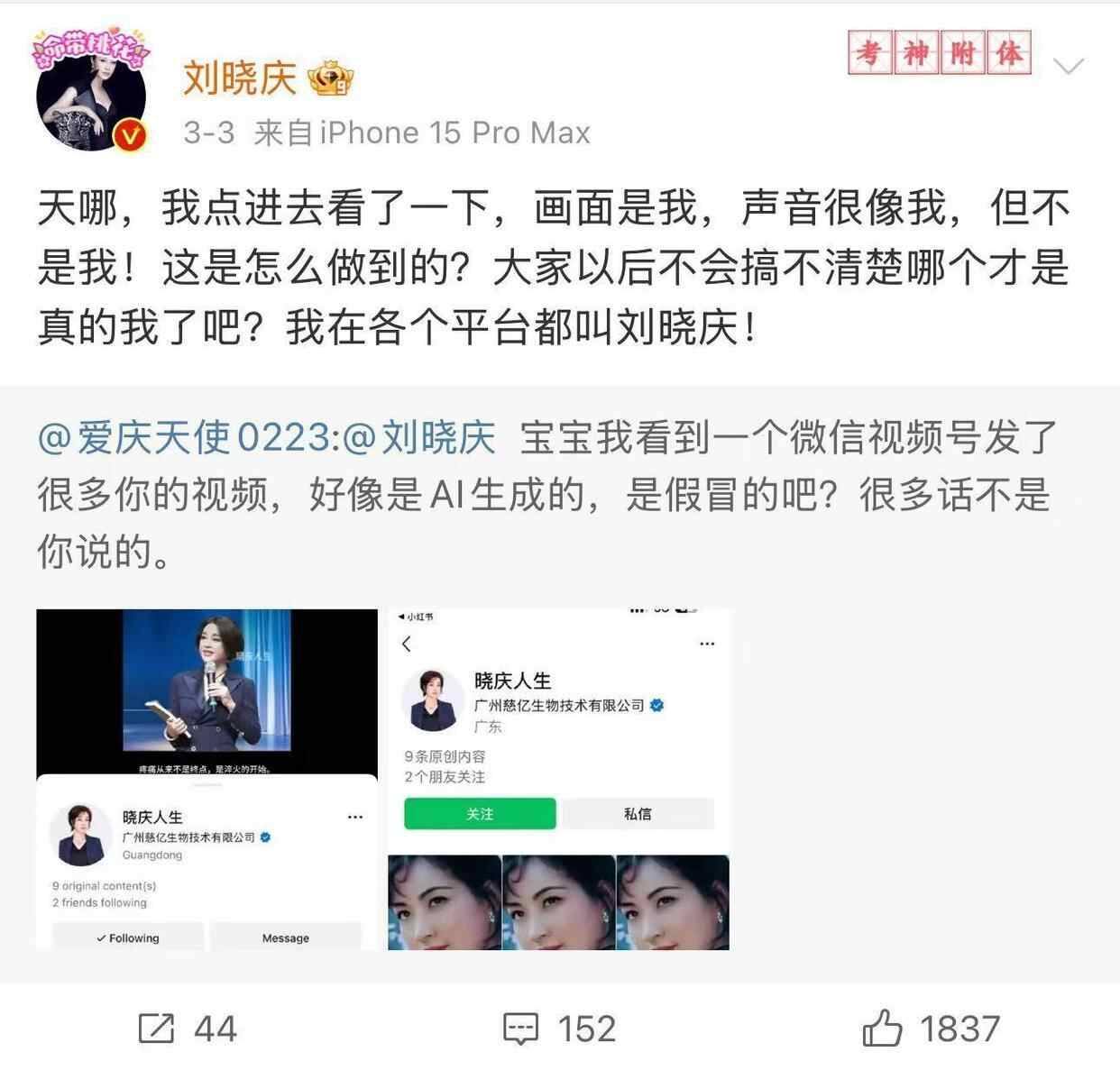 此前、刘晓庆、古天乐、林峯等明星艺人也曾针对AI“假人”视频公开辟谣。