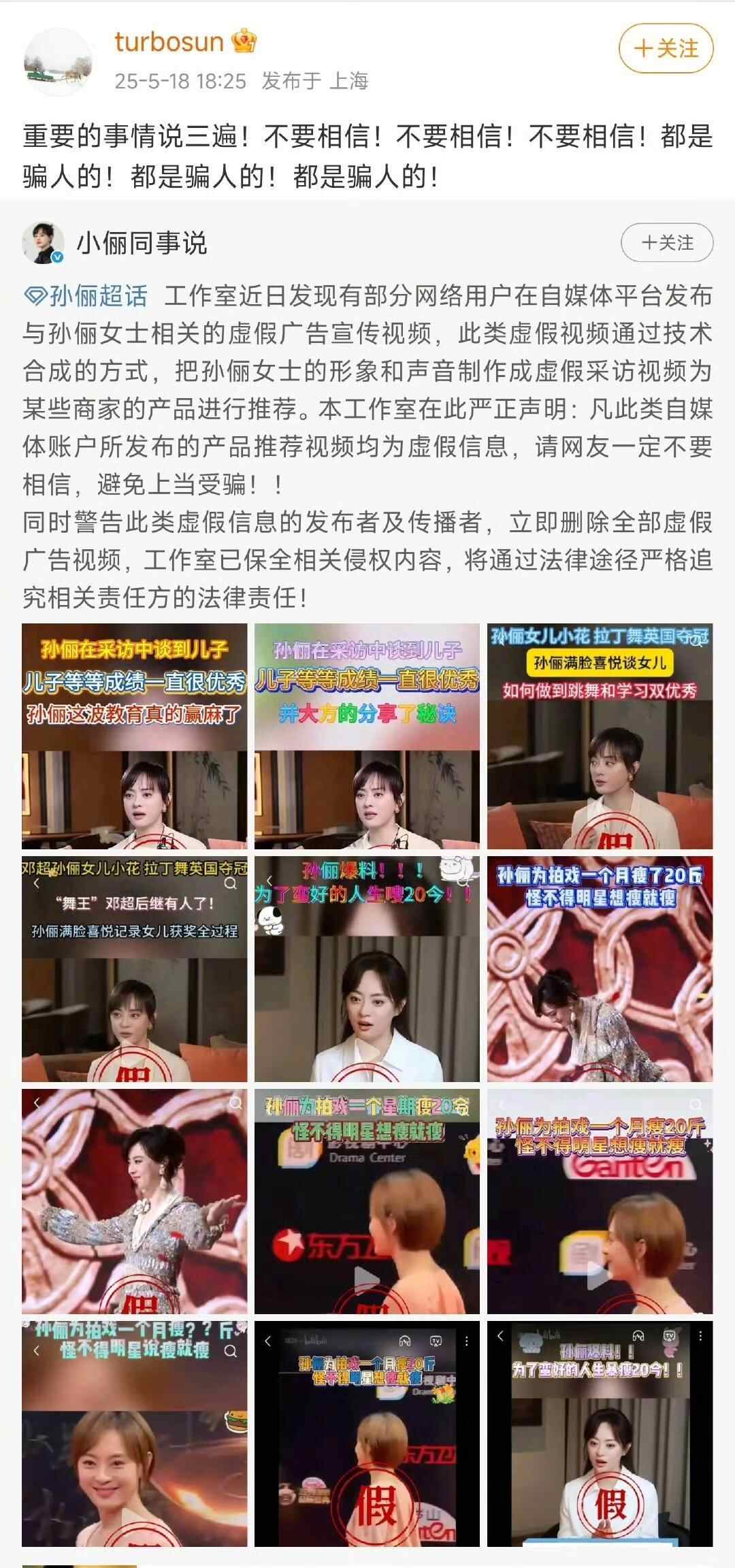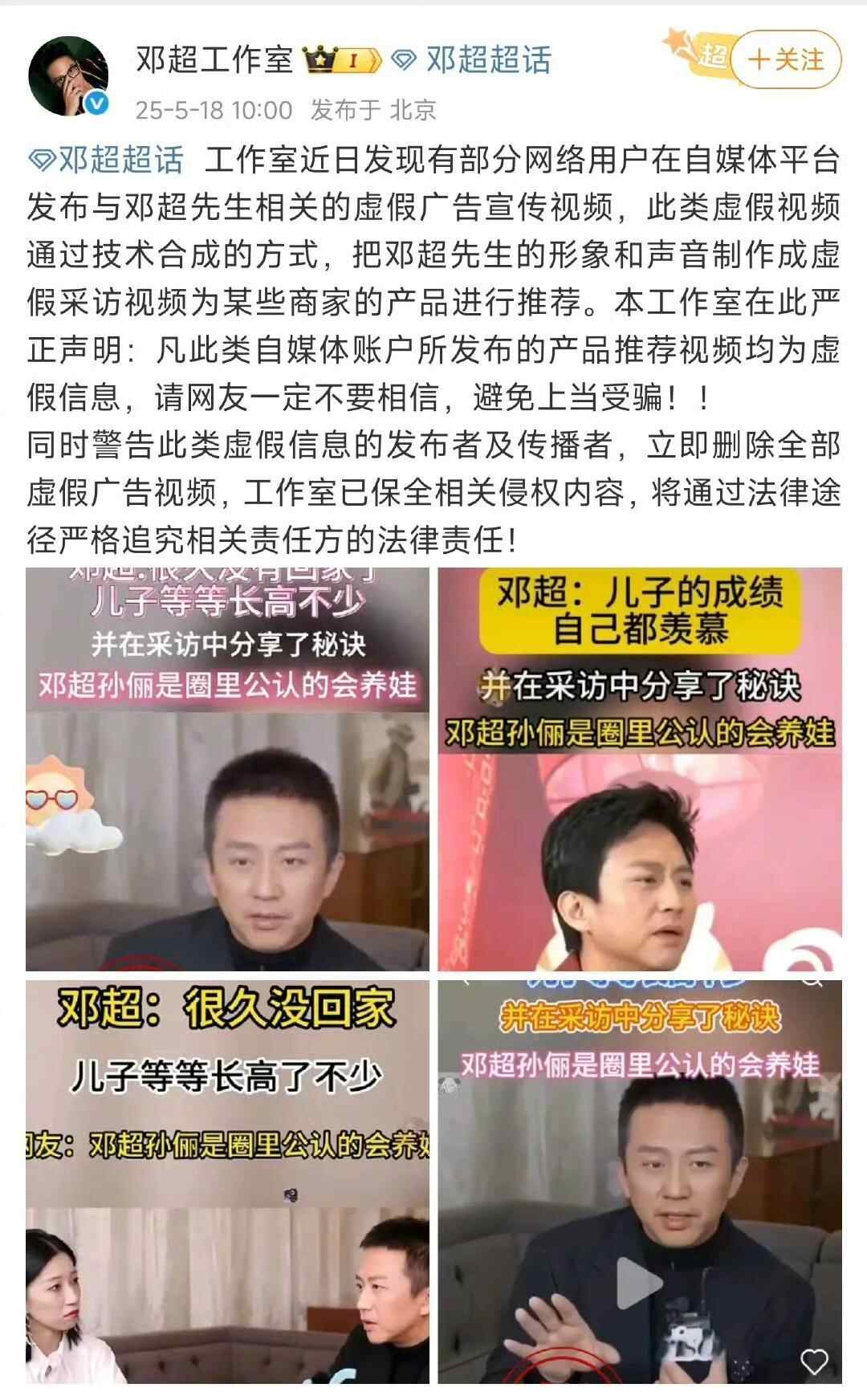 5月18日,知名演员邓超、孙俪夫妇工作室发文打假AI虚假广告,表示发现有部分网络用户在自媒体平台发布与邓超、孙俪相关的虚假广告宣传视频,这类视频通过技术合成的方式将邓超、孙俪的形象和声音制作成虚假采访视频为某些商家的产品进行推荐。“凡此类自媒体账户所发布的产品推荐视频均为虚假信息,请网友一定不要相信,避免上当受骗! ”