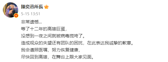 5月15日,陈奕迅曾发布微博,提到“等了十二年的高雄巨蛋,没想到一夜之间被病毒搅垮。”他还表示会遵照医嘱努力恢复健康,尽快回到高雄在舞台上跟大家见面。